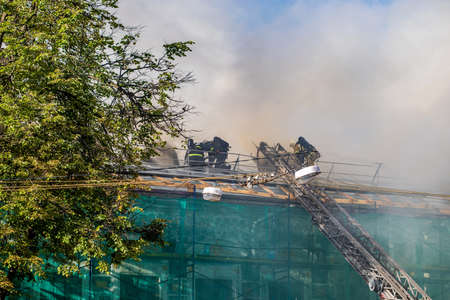 RUSSIA, Nizhny Novgorod - June 25, 2020: fire burns building. firefighters extinguish a building. Burning Museum in Nizhny Novgorod