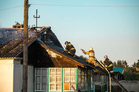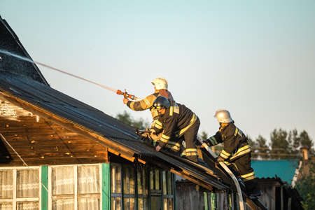 Firefighters in the form of the Ministry of Emergency Situations on the roof extinguish a burning house
