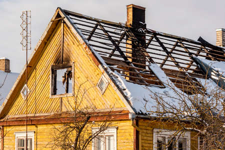 Rooftop fire damage. Day after a big fire in a roof of a house