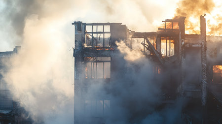 A multi-storey building stands engulfed in flames and thick black smoke, with debris scattered around, showcasing the aftermath of a devastating fire explosion in an urban setting. Generative AI.
