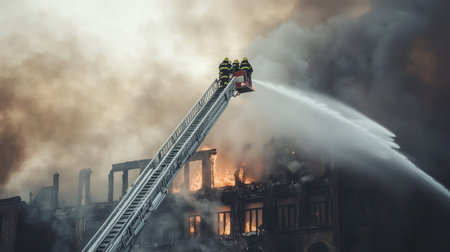 two firefighters battling a blaze on the rooftop of a building, created with generative ai