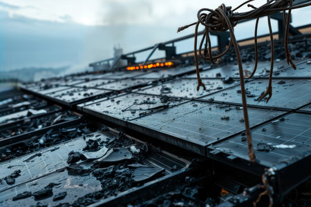 Damaged Solar Panels. A close-up image of solar panels damaged by fire, with wires and debris scattered around.