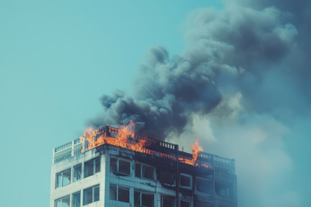 A raging fire engulfing a building, with billowing smoke filling the sky