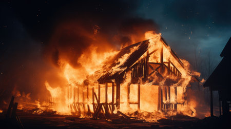 A vivid portrayal of a house engulfed in flames, set against a dark backdrop. The houses silhouette is sharply contrasted by the bright orange and yellow hues of the flames, creating a striking visual effect.