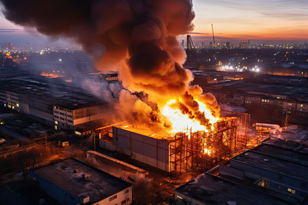 Massive large blaze fire in the city, brick factory building on fire, hell major fire explosion flame blast, with firefighters team firemen on duty, arson, burning house destruction