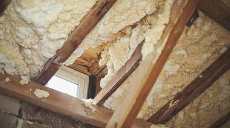 This image displays an exposed roof space featuring insulation and wooden beams, highlighting elements of a renovation project. The raw materials offer insights into interior construction and design.