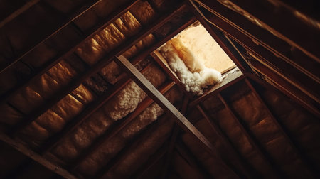 A captivating view of bright sunlight entering through an open hatch in a rustic attic, surrounded by soft insulation and wooden beams, creating warmth and atmosphere.
