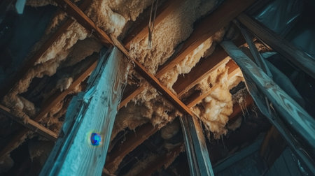 A close-up view of a deteriorating ceiling structure, revealing insulation and wooden framework. This image captures the essence of neglect and decay in an abandoned interior space.