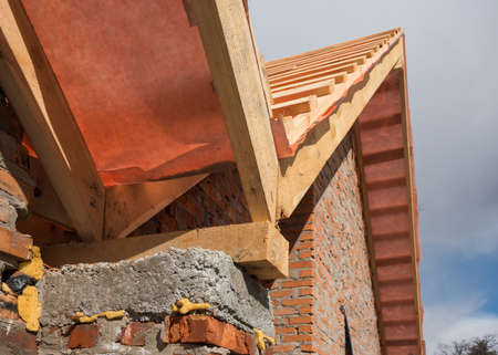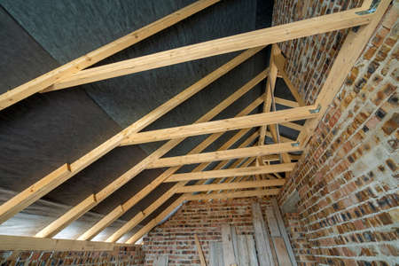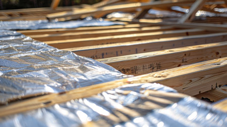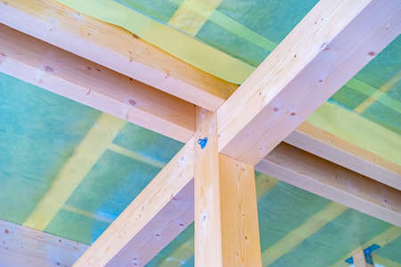 New residential construction home framing and installation of wooden beams at the roof truss system and vapor barriers of the house.