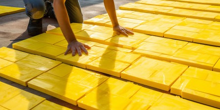 Worker installing yellow roof tiles on construction site. Worker installing roof tiles.