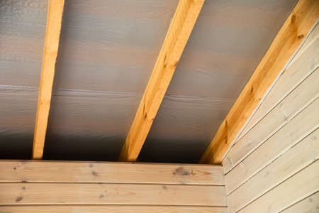 Interior of the attic of a wooden house under construction with foam polyurea