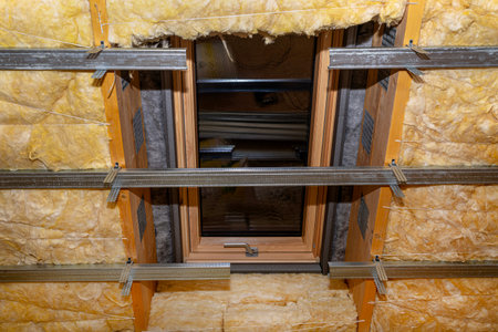 Aluminum frame with hangers placed on beams in the attic for mounting plasterboards, visible roof window.