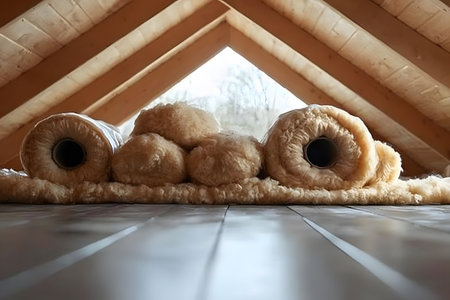 Rolled wool insulation sits on a wooden floor in a triangular attic space, emphasizing sustainable building practices and energy efficiency. natural light bathes the scene, eco-conscious home design. Generative AI