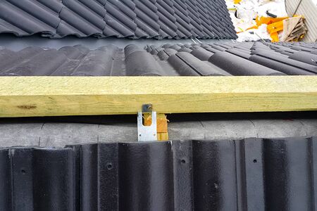 Modern roof made. Installation of the roof of the house from ceramic black tiles. Installation of tiles on the roof.