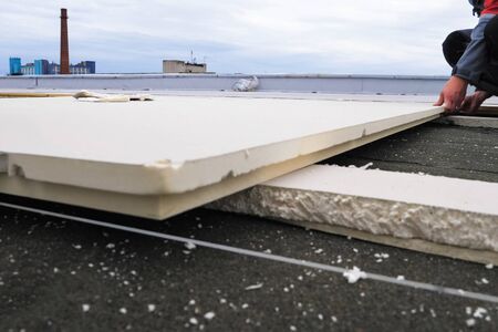Roofing insulation, installation of insulation sheets on foam. Foam and insulation.