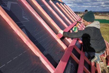 Irpin - Ukraine, March - 13, 2021: Roofing contractors installing roof boards and vapor barriers for metal tiles in winter time. Insulation of the facade of the house.