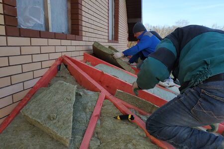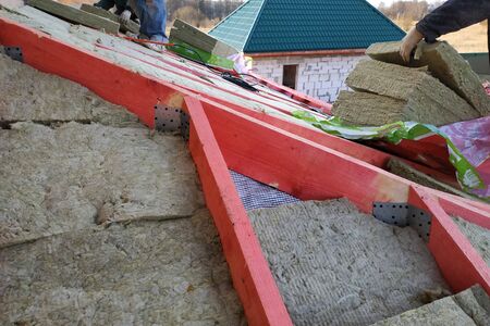 Roofers Repair and Installing House Roof Thermal Insuation with Mineral Wool, Roofing Construction