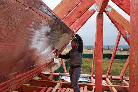 Insulation and waterproofing of the roof surface, the worker nails the film to the boards.2020