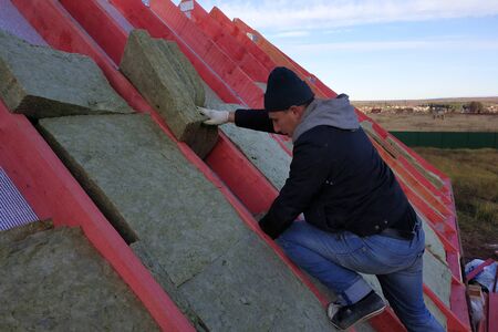 Man installs a thermal insulation layer on the roof - using mineral wool panels.2020
