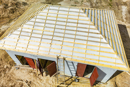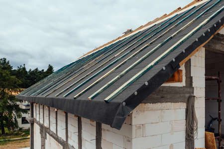 The roof of new house is being installed with environmentally friendly and energy efficient thermal insulation