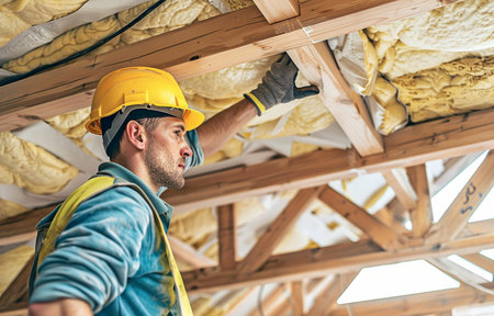 Worker is fitting insulation material into wooden ceiling beams of house, enhancing energy efficiency.