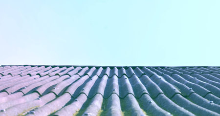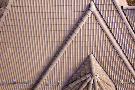 Closeup of house roof top covered with ceramic shingles. Tiled covering of building