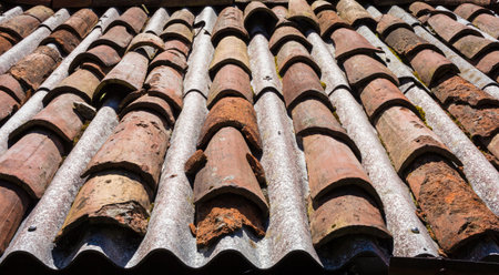 The arrangement of weathered terracotta tiles displays various shades of orange and gray, highlighting years of exposure to the elements and creating a unique rustic texture.