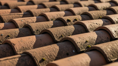 Classic terracotta roof tiles arranged in an overlapping pattern, illuminated by bright sunlight, creating a warm, textured surface. ideal for architectural, construction, or traditional design themes.