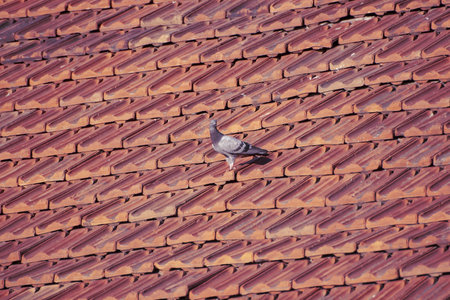 An overhead view reveals a detailed terracotta tiled roof, exhibiting a weathered texture. The warm, earthy tones of the tiles contrast with a blurred background suggesting a residential area. The shot is captured in daylight with natural illumination, and could be utilized for various commercial and illustrative purposes.