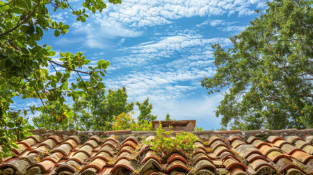 Neglected terracotta roof with plants between tiles, clear sky, and green trees highlighting weather effects and neglect