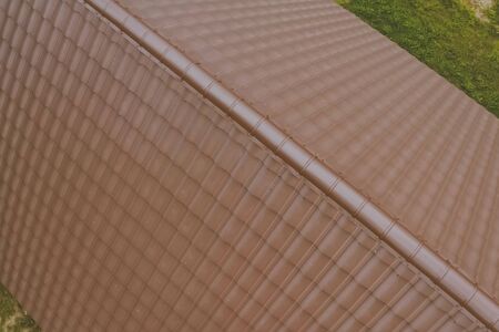 Modern roof made of metal. Brown metal tile on the roof of the house. Corrugated metal roof and metal roofing.