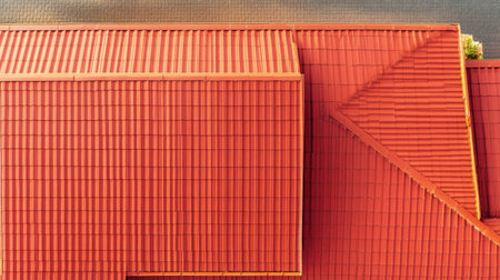 A stunning aerial view showcasing the vibrant red roof tiles of a residential building. Capture the unique texture and architectural design elements in this compelling image.