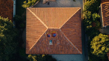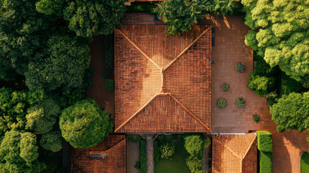 This aerial image showcases a warm terracotta roof adorned with vibrant colors and surrounded by lush greenery, creating a peaceful and serene atmosphere.