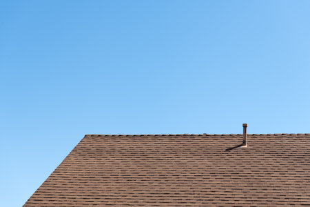 A fragment of a suburban house with a gable roof, featuring neatly arranged shingles and a small ventilation window, under a bright summer sky.