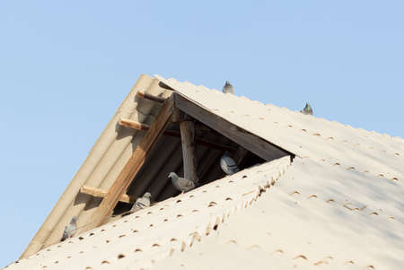 Roof and blue sky landscape,brown roof at right of photo in the sky