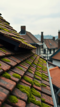 Moss-covered rooftops in a historic town showcasing traditional architecture and serene skyline