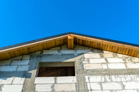 Construction of a small house made of white brick, visible gable roof with boarding and concrete pillars.
