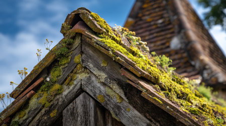 A captivating close-up of a moss-covered roof showcasing rustic wood, natural textures, and a serene blue sky background, perfect for conveying tranquility in nature.