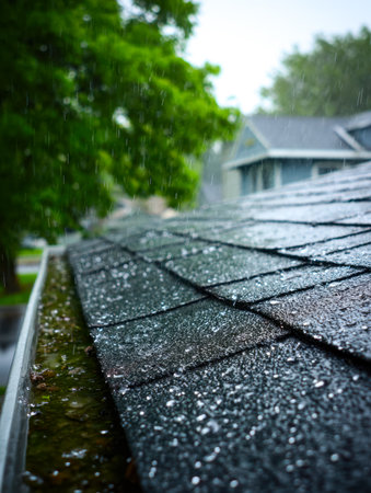 A cozy suburban scene featuring glistening asphalt shingles dotted with shimmering water droplets, capturing the calm essence of a soft rainfall daylight.