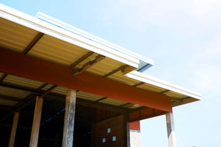 Brown corrugated metal profile roof installed on a modern house. The roof of corrugated sheet. Roofing of metal profile wavy shape. Modern roof made of metal. Metal roofing.