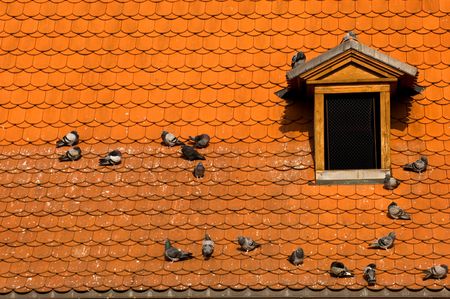 Aged roofing tiles on old house in village. A lot of moss on tiled roof of hovel.