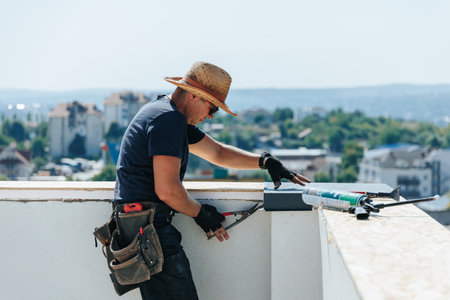Experienced roofer in work attire fixing roof with urban city skyline in the background