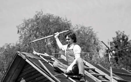 Construction worker on the roof of an old house in the rays of the setting sun