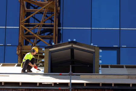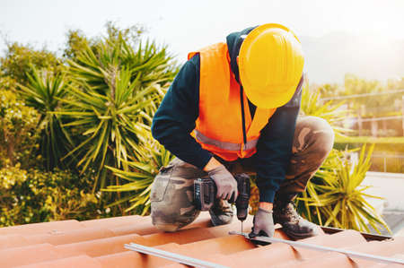 Worker repairing the roof on a construction site. Electric drill used on roof, Roof construction concept.