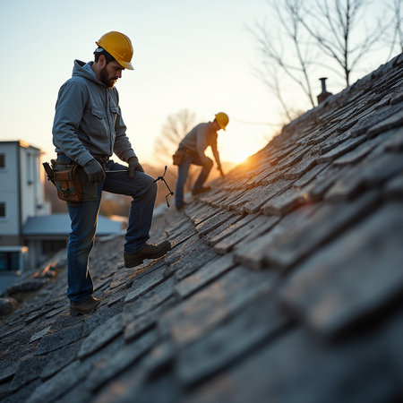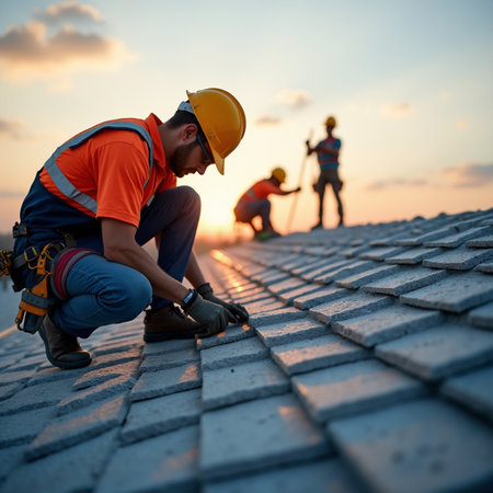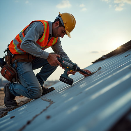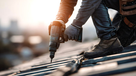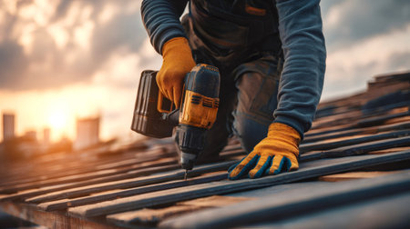 Construction worker wearing protective gloves installing new roof tiles on a house during renovation, using a powerful cordless electric drill against a warm sunset sky