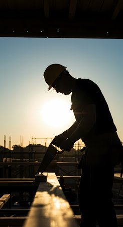 Silhouette of a worker at the construction site with sunset background
