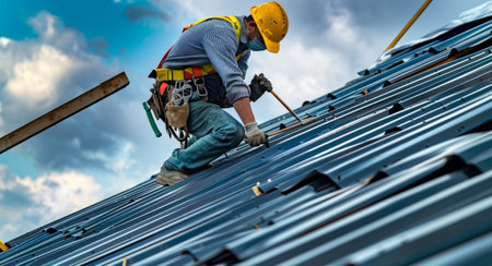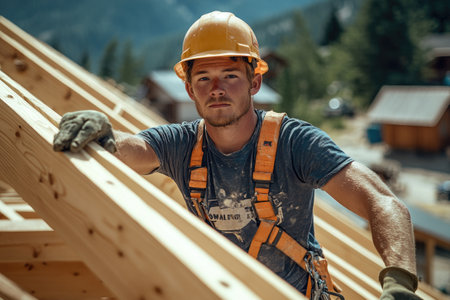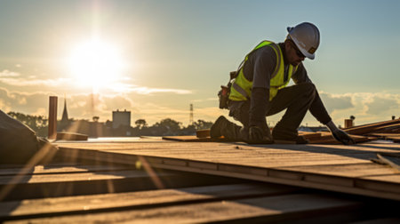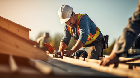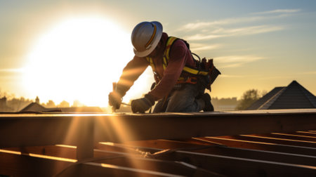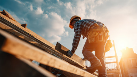 A construction worker skillfully assembles a wooden roof under a sunlit sky, symbolizing craftsmanship and effort. The image captures high-quality lighting and a sense of dedication.