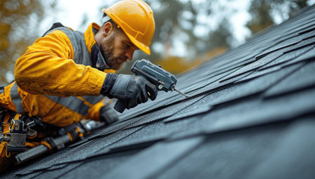 A roofer in high-visibility working on the roof of an apartment building, holding and operating a nail gun to secure shingles. The image captures the details of the tools and uniform, with a focused expression on the worker's face as they apply the nails. The background is a grey-colored house roof, and the close-up shot showcases the professional photography style, capturing every detail of the workwear and equipment in high resolution. --ar 53:30 --stylize 750 --v 6.1 Job ID: 13cdbf0a-5aab-400d-b5a9-244089dca0f2
