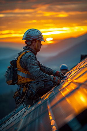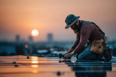 Skilled construction worker is installing solar panels on a rooftop during sunset, showcasing dedication and craftsmanship in a serene environment.