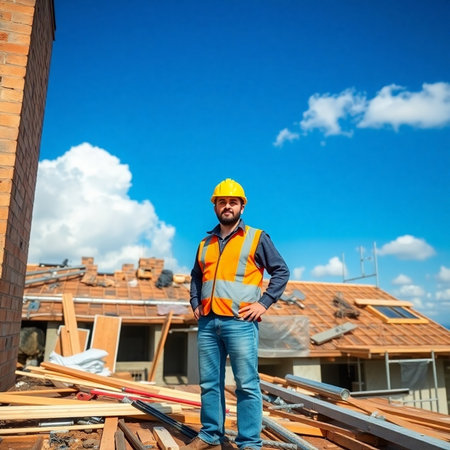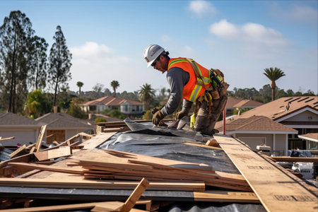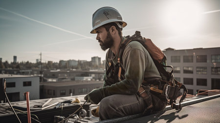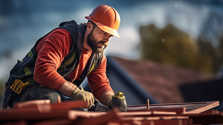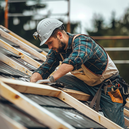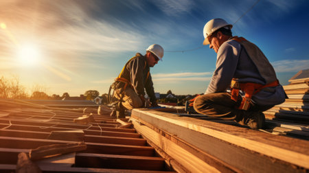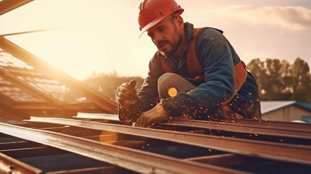 On a building site, a worker roofer builds a roof structure using Generative AI.